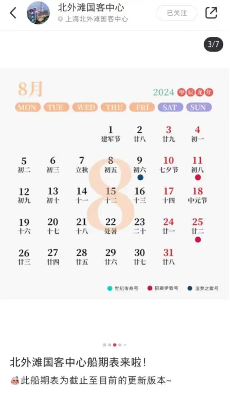 二是在官方小红书账号“北外滩国客中心”中发布船期信息笔记并长期置顶。