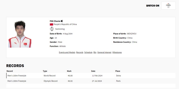 去年9月的杭州亚运会,潘展乐曾以46秒97的成绩摘金并打破亚运会纪录,成为该项目上第一个游进47秒的亚洲运动员。今年2月的多哈世锦赛上,潘展乐在男子4×100米自由泳接力决赛,第一棒游出46秒80的成绩,打破罗马尼亚天才波波维奇46秒86的世界纪录。今天打破奥运会纪录后,巴黎奥运会的官方资料卡已迅速更新:男子100米自由泳世界纪录与奥运纪录保持者潘展乐。