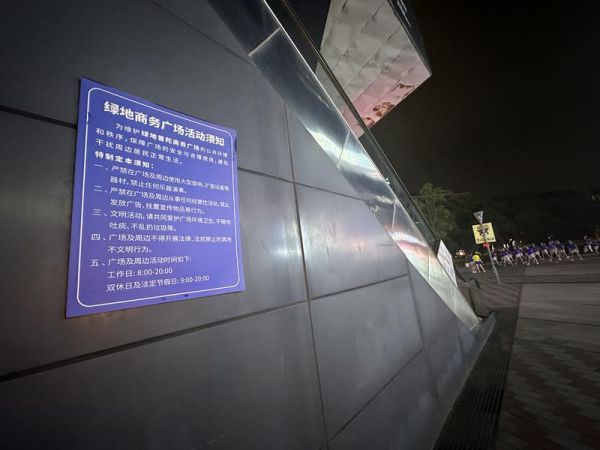 近日,记者来到现场走访。在新村路上的绿地普陀商务广场,有两支舞队。一支七八人的舞团正随着音乐起舞,另一支十多人的队伍身穿统一服装,在领队带领下整齐划一地跳操,现场噪声最大分贝值为74。在该广场醒目处,张贴着“活动须知”:严禁在广场及周边使用大型音响、扩音设备等器材,同时规定活动时间最晚到20时。