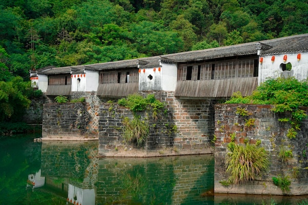 从休宁县城沿屯黄公路北行十余公里,便到了蓝田镇南面的岭下村。村头有一座古色古香的廊桥,桥头上嵌有“拱北桥”三个大字。桥长70.7米,宽5米,高7.6米。桥上筑有精致的遮风挡雨的廊房,廊房两沿均置靠背长条凳供来往行人憩息。凭廊远眺,青山耸翠,万壑争流,一派闲云野趣,令人心旷神怡。