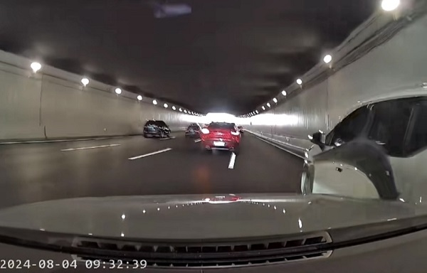 该车驾驶员随即随前车一起减速。当前车驶入宜山路地道约50米后,突然向左变道,避让抛锚在四号车道上的一辆白色SUV。由于“黑洞现象”加上跟车距离较近,后车驾驶员因光线变化及前车突然变道的原因,未能及时发现停在四号车道上停着的车辆,虽然驾驶员向左打方向,但还是撞上了停在车道上的车辆。