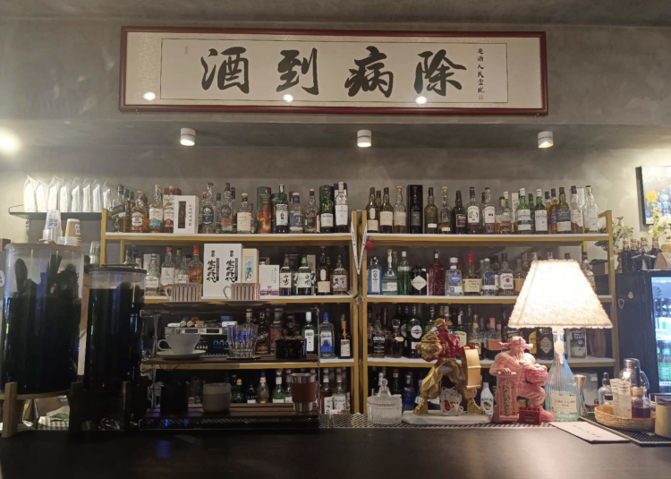 酒吧正中央挂着一块“酒到病除”的牌匾,下方一排排酒水将人拉回了小店的主业:卖酒。各色鸡尾酒、威士忌看得人眼花缭乱。