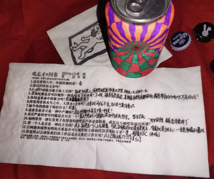 随机打开这家酒吧的纸巾,上面印刷的问题可谓是千奇百怪:“你讨厌你的父亲吗?”、“爱一个人是否是一种民主实践?”、“你觉得AI会废除我们的工作还是让我们工作至死?”、“如何看待一群长发男子在深夜的酒吧里高声谈论德勒兹?”……