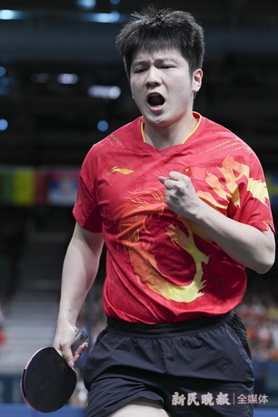 樊振东庆祝得分 记者 李铭珅 摄