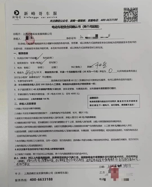 19岁的小李反映,他于6月底看见一则招聘骑手信息,特意从外地赶来上海求职。但自面试开始,就隐隐感觉不对劲,“公司和地点与招聘信息说的完全不一样”。面试时,工作人员并没过多介绍工作内容,只是强调会提供电动车,干满两个月能报销租车费699元。随后,让他签订了一份上海进峰实业发展有限公司的电瓶车租赁合同。“没给我纸质版的合同留底,而且上面也没有盖任何公章。”
