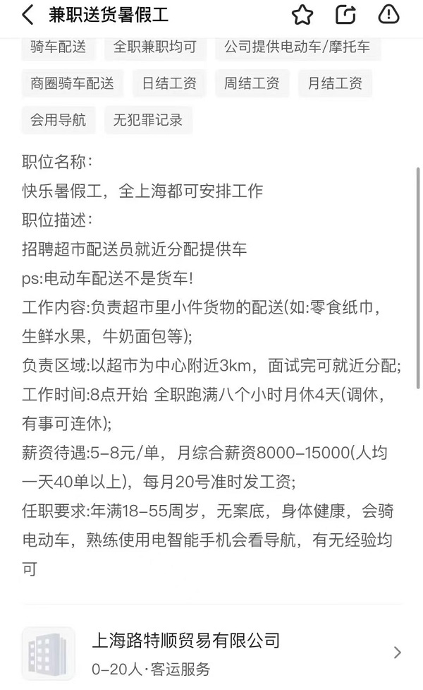 工作三天后,越来越多问题浮现。“上班时间分配卡很死,无法自主选择,而且工作时长也超负荷。”此外,收入情况也不如承诺那般“美好”。小陈决定提前结束兼职工作。