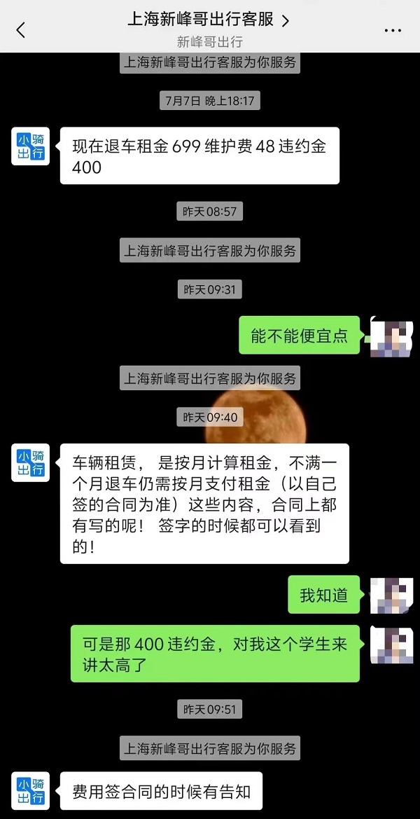 最让他生气的是,到达站点后被告知要从早上9点干到晚上10点,承诺与实际不符。“忽悠我每月至少能挣到6000元,但站点老员工说不可能赚那么多,高薪只是他们诓骗大学生来干活的幌子。”他联系车行想要退车不做了,此时又被告知合同上写明租赁时间少于两个月,退租除租金外还要支付违约金,算下来总计1147元。“车行不给我解约,让我去找面试的公司解约,但那里又踢给车行。”兜兜转转,他不知到底该找谁反映。
