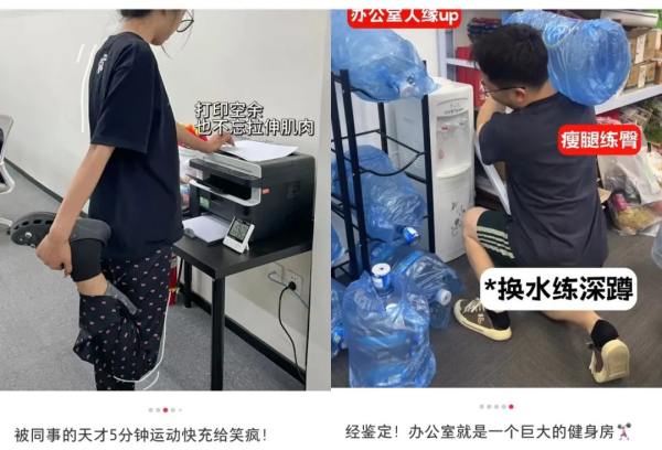 小林并不是他们部门的特例,他告诉记者,“随着‘5分钟运动快充’在网上火了,我们部门每个同事都在践行这个健身方式,有同事用电脑当作锻炼臂力的工具,还有很多同事拿着外卖走楼梯,一方面是因为中午电梯排队时间长,另一方面也是想见缝插针增加运动时间,活动一下身体。”