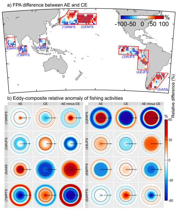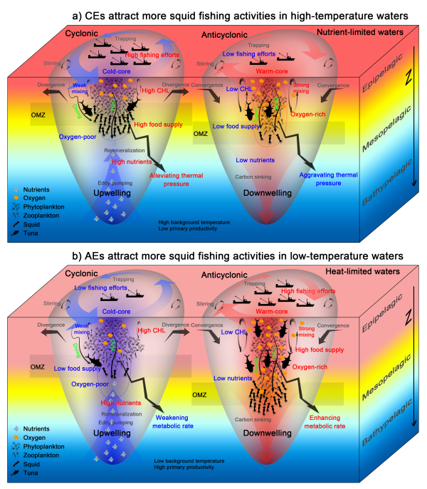 聚焦中尺度涡对全球大洋鱿鱼渔场的影响,该研究应用基于卫星的高分辨率全球捕捞活动数据集,对全球大洋中主要的鱿鱼渔场进行了一系列的统计分析,发现中尺度涡对全球主要的大洋鱿鱼渔场捕捞活动产生了一种纬向反转的影响,即热带(温带)水域的鱿鱼捕捞活动更倾向于聚集在气旋涡(反气旋涡)核心,并且这一影响模式会随着涡旋强度的增强而放大。结合过去中尺度涡对顶级捕食者影响的研究结果,该研究推测中尺度涡对鱿鱼捕捞活动的影响更多是由海洋环境驱动的下行控制所调节。