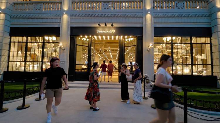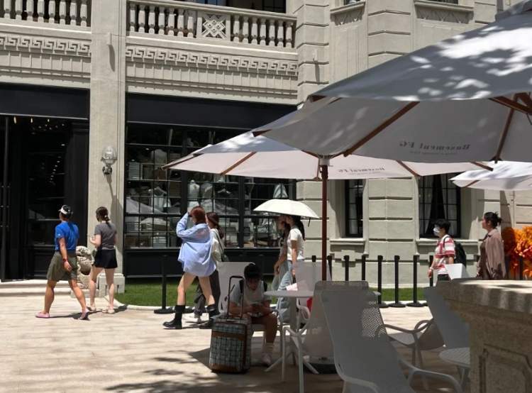 记者在该店门前看到,此前首席公馆精品酒店的围墙和大门全部被敲掉,门前的花园全部铺平,摆上太阳伞户外椅,不少买完衣服的年轻潮人、在附近遛弯的居民坐着休息。