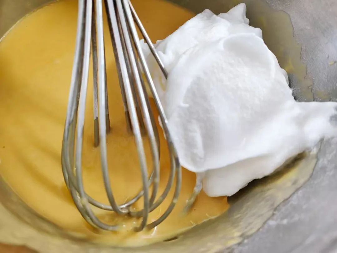 3.蛋白霜和酸奶蛋黄糊搅拌均匀,烤箱上下火160°预热10分钟。