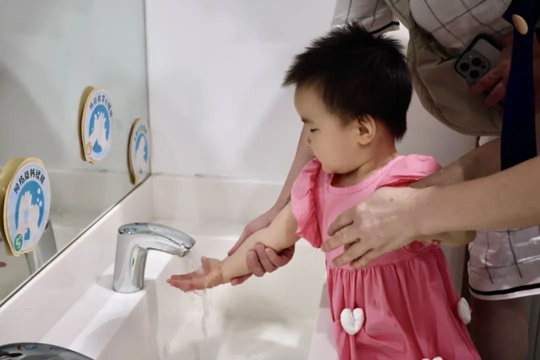 进入宝宝屋前,所有人都要在一楼进行严格的清洁,成人需穿着鞋套。晶晶在老师的引导下,认真地清洗小手。孩子们来到宝宝屋,保健老师会对其进行健康预检。活动结束后,也会对活动室环境进行彻底的清洁。