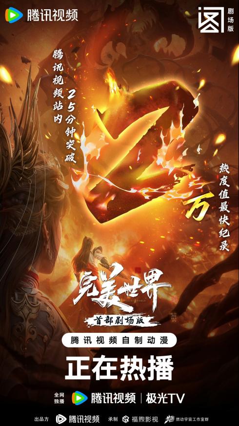 《完美世界》动画首部剧场版《火之灰烬》昨日在腾讯视频正式上线。作为腾讯视频动漫年番中第一部拥有剧场版的作品,《完美世界》剧场版在开播前,就获得了超280万的预约量。延续年番精良的视觉特效,凭借原创剧情及深刻的精神内涵,《完美世界》剧场版在上线首播后迅速赢得观众的广泛关注与好评。上线25分钟即突破了腾讯视频20000热度值,也是2024年度全部动漫IP中最快突破这一数值的动画作品。剧场版的成功孵化也为头部国漫IP的长线开发带来了全新样本。