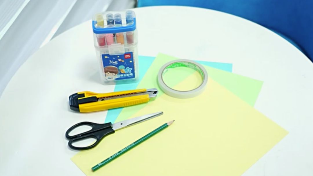 卡纸(浅色或白色)、水彩笔、铅笔、剪刀、双面胶、美工刀(备用)