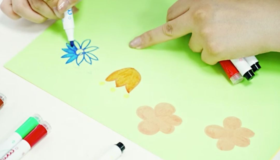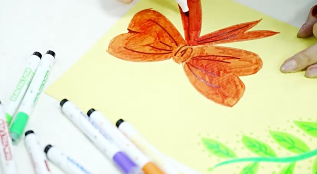 4.在浅色或白色卡纸上画上喜欢的花朵图案,画个蝴蝶结作为花瓶的装饰。