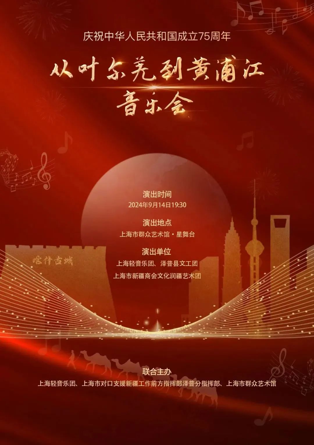 上海轻音乐团、上海市对口支援新疆工作前方指挥部泽普分指挥部和上海市群众艺术馆联合主办《从叶尔羌到黄浦江》音乐会将于9月14日晚在上海市群艺馆上演。
