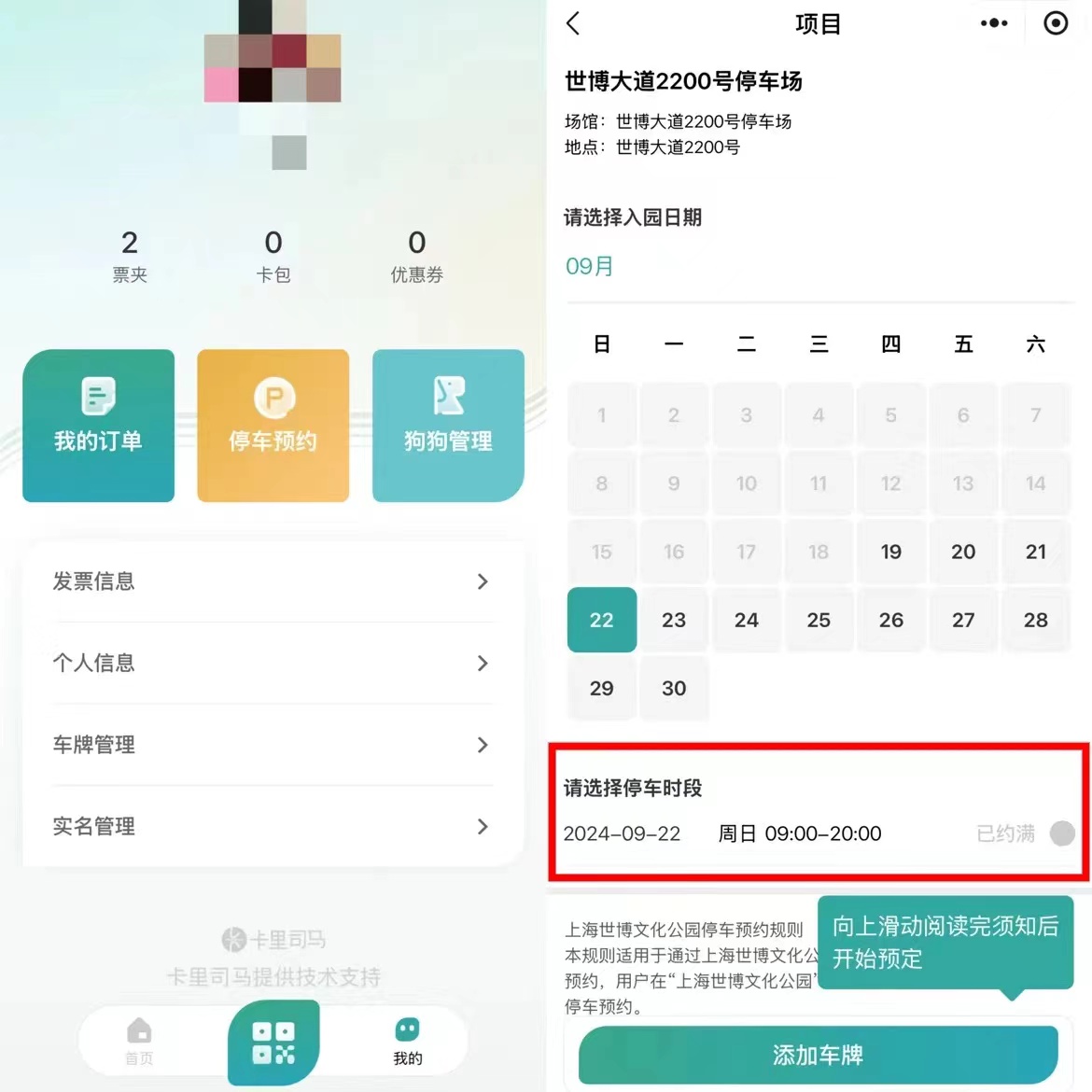 其中,世博大道融合段停车场实行预约停车制度。停车预约同样是在小程序内。点击“我的”页面进行停车预约。