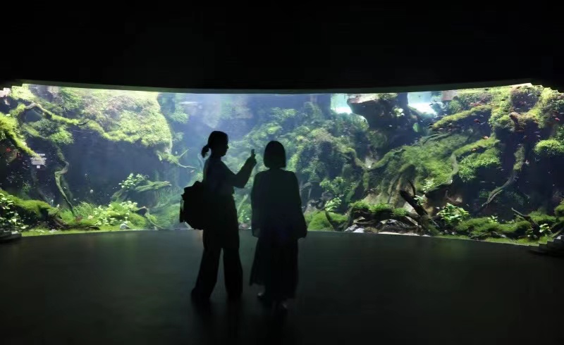 馆内的水底森林区域,有目前国内温室中最大的沉水植物生态鱼缸,长12米,水深4米。