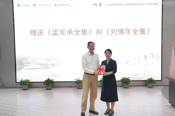 活动中,华东师范大学教育学部主任袁振国代表学校,向上海社会科学馆代表、上海市社会科学事业发展研究中心副主任毕旭玲赠送13卷本《孟宪承全集》和《大夏教育文存·刘佛年卷》。