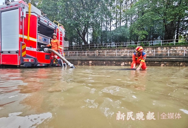 图说:上海各部门与时间赛跑,快速处置汛情。图为金山区消防部门9月20日上午到石化街道卫零路下立交抢排积水。新民晚报记者 陶磊 摄