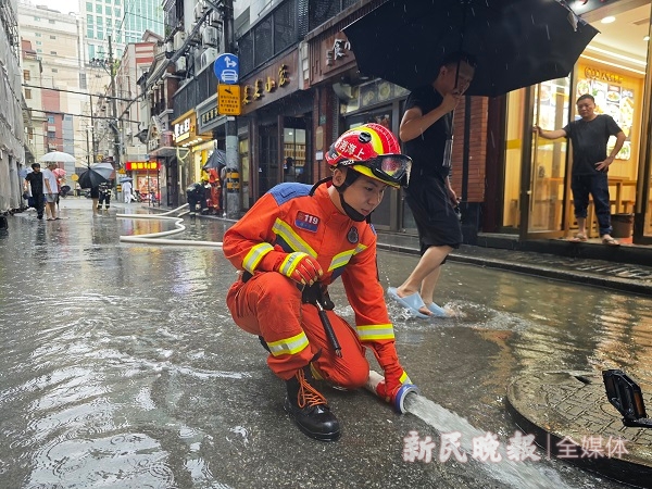 图说:“普拉桑”强袭申城后,消防人员在天津路抢排积水 新民晚报记者 刘歆 摄