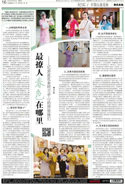 津羽老师《我的昆曲十》的封面上写着她的理想境界:将舞台上精致唯美的艺术美学融入生活。她的愿景在琼、瑾、静、清、霞等一众师姐妹那里得到了实践。真是“不到园林,怎知春色如许?”原来最撩人的“春色”就在我们众师姐妹的心里。(王小鹰)