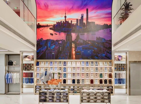 外立面环大楼而设的800㎡巨幕裸眼3D屏,成为南京东路上标志性的打卡点。内部设计则注重空间感的提升和海派文化的融合。大型主题瀑布墙与主衬衫墙结合,营造出“向上”的视觉感。“海派摩登”的主题陈列展现了上海独特的时尚风格和文化现象,融合中西方元素,体现现代、精致、得体的生活方式和审美情趣。而演员董勇和黄觉因为热播剧《繁花》里的“范厂长”和“强总”与这个来自宁波的服装品牌再次相遇上海南京东路。