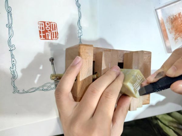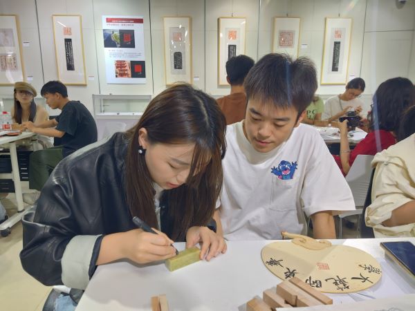 开幕式后,首场篆刻体验工作坊在展厅内举行。记者在现场看到,报名参与者来自大夏印社的招募,其中不乏第一次握印刀的艺术爱好者,在书法篆刻专业研究生的指导下,围绕国庆进行主题篆刻,篆刻内容包括振兴中华、千秋伟业、锦绣山河、普天同庆等,大夏印社副社长程羽瑄为艺术爱好者们设计了“摹印篆”结构,方便初学者描摹。来自同校通信与电子工程学院的工科生刘舟锐是初学者,“小老师”是书法篆刻专业的沈紫欣同学。初学者向“小老师们”一对一地请教,从握刀、推刀的基本要领学起。与此同时,参与者们也了解到有着二千余年历史的中国印章的文化内涵:它们是凭信符号和权力象征,最早印章是伴随殷墟之地甲骨文一起出土,北京奥运会会徽让全世界认识了中国印章的当代形象。篆刻体验工作坊还吸引到了国际留学生以及华师大二附中的中学生参加。