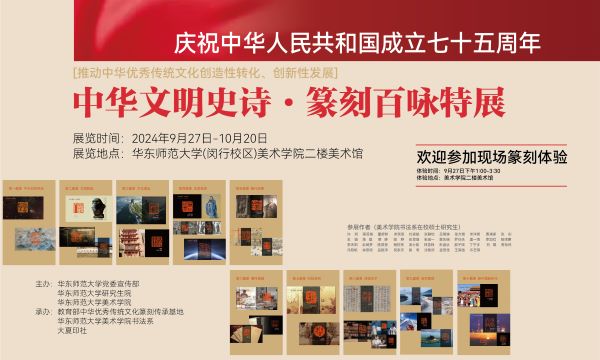 据悉,华东师范大学作为教育部中华优秀传统文化篆刻传承地,坚持传播中国篆刻艺术,从课堂到校园,从市内到市外,从国内到海外,解决了古老的篆刻艺术在新时代发挥社会功能和作用的问题,使篆刻艺术真正做到了创造性转化、创新性发展,走出了一条颇具特色的传播之路。本次展览由华东师范大学党委宣传部、研究生院、美术学院主办,教育部中华优秀传统文化篆刻传承基地、美术学院书法系、大夏印社承办。展览持续至10月20日。