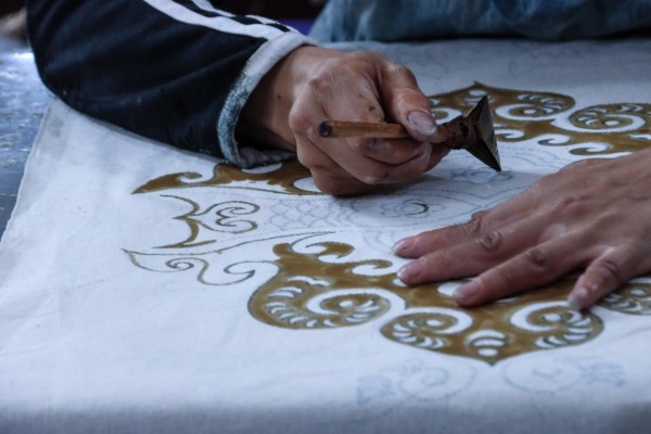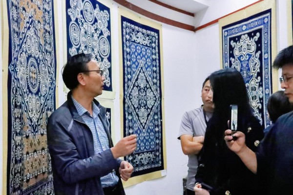 作为以“非遗寻踪”为主题的旅居体验活动,此次行程还特别前往了安顺蜡染博物馆,这里收藏了一千多件来自贵州的民间蜡染作品,是一个苗族蜡染文化的集中展示地。在馆长的介绍下,体验团的成员深入苗族先民们的民族图腾标志与蜡染文化,并亲自动手参与到蜡染产品的设计和制作过程中,感受传统民族非遗的技艺与魅力。