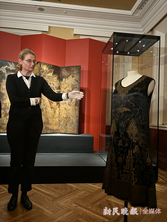 行至二楼展厅,一件诞生于1925年的黑金色热罗姆晚装裙静静地等待着观众。黑色丝绸上是金属线织就的繁复花纹,在灯光的映射下,才发现花纹竟然是立体的。“这条晚装裙真实反映了上世纪20年代的时尚流行。裙身线条简单流畅,裙长较短,V领展示女性特点,便于身着这件裙子的女性进行身体活动。复杂的花纹,展示出时代对美的理解。”巴黎市立时尚博物馆加列拉宫馆藏部主任克里内·多姆介绍。在热罗姆晚装裙一旁,与之“对话”的是同时代上海装饰艺术仙鹤纹可翻式餐椅。一位上海无名工匠的作品,与法国同时代的顶尖时尚,在一个世纪之后同处一个现实场域,默默进行着交流。