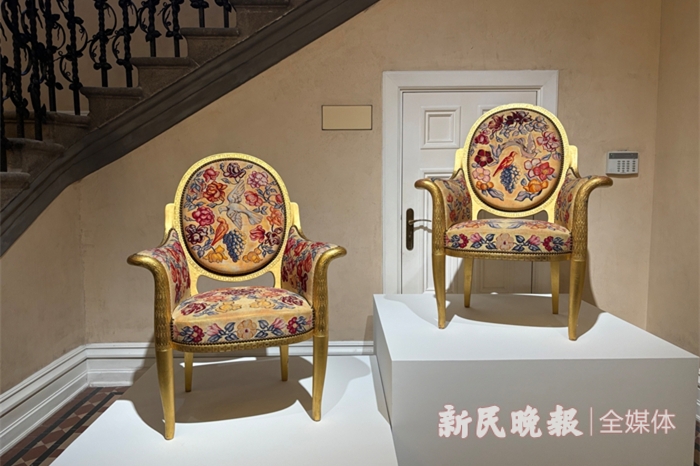 当来自法国国家家具管理馆收藏的百岁“金鸟沙发”从木箱中缓缓抬出时,现场响起一片相机的咔嚓声。“金鸟沙发”由鎏金榉木、羊毛、丝绸制成,金色的线条华丽流畅。据介绍,整套金鸟家具包括一张沙发、六把椅子和一面屏风,艺术家阿尔芒-阿尔贝·拉托设计了整套家具的框架。织锦部分由深受“纳比派”和“野兽派”影响的法国画家勒内·皮奥绘制。1925年,巴黎国际装饰艺术与现代工业博览会上,金鸟家具中的屏风与扶手椅在巴黎大皇宫展出。上世纪80年代,金鸟家具摆放在法国爱丽舍宫,这也是家具的最后一次使用。