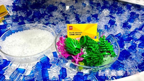 而在另一边,一个展示可持续原材料的展台也吸引了大家的关注。一棵棵绿植零部件,原来是用生物聚乙烯材料制成,有些原料甚至是从甘蔗中提取出;一粒蓝白相间的颗粒,其原材料为人造大理石,令人称奇。甚至连内部包装袋也从塑料变成了纸质,一方面更环保,另一方面还能“站立”在桌上,在拼搭时不会导致零件洒出。据悉,自2023年起,乐高可再生材料取得了83%的增长,2024年上半年,制造乐高积木颗粒的原材料中,可再生材料平均占比为22%。