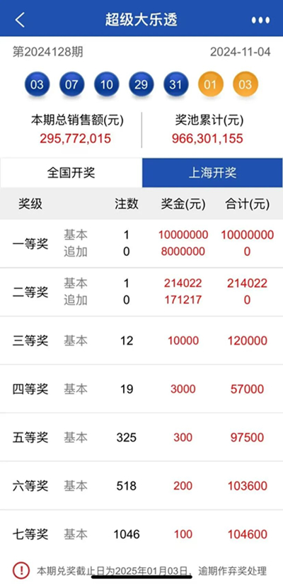 本期共开出两注一等奖,其中1注来自本市,单注奖金1000万元;该注基础一等奖出自位于青浦区青湖路959号罗森便利店的市属33307网点。