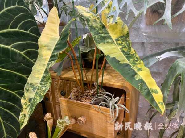 “真的是贵客!”工作人员介绍,或许和都市人生活压力大,渴望通过自然疗愈的心情有关,这两年,热带植物引来拥趸无数。天南星科花烛属的很多植物有着心形的叶片,似乎无声地传递着来自“老家”南美雨林深处的爱意,因此,在绿植爱好者中有着“植物的尽头是热植,热植的尽头是花烛”的说法,身价不菲。记者留意到,“客厅”角落里的一盆植物,绿色的叶片上有不规则的黄色斑纹。原来,它便是有着绿植圈“爱马仕”之称的“橙柄锦蔓绿绒”,同为天南星科植物。