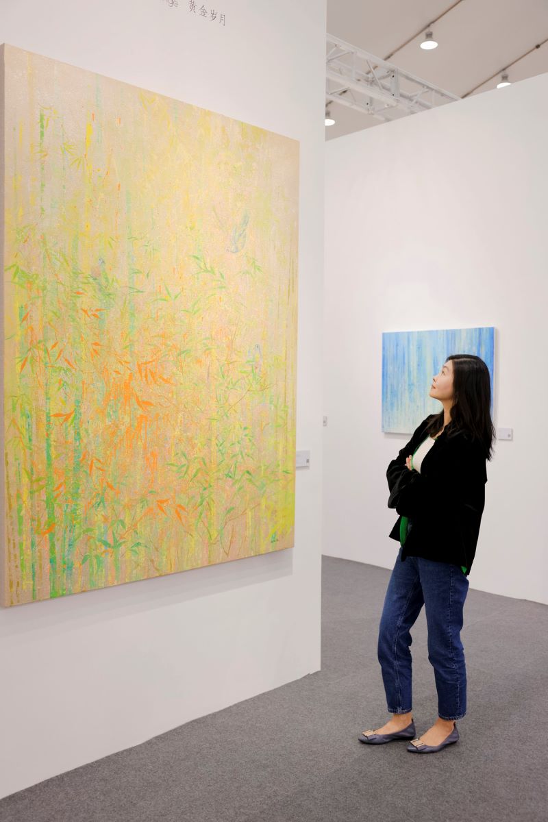 在画作《黄金岁月》中,张佩瑶用金色绘出纤纤风骨,竹林构图在远处一目了然,用色与点墨则打破了中国传统工笔画传统。近观这件作品,可以看到传统工笔竹叶与自由泼洒的油彩之间的奇妙交融,隐匿其中的禽鸟赋予了画作生动自由的气息,奔放的写意与细腻的工笔技法在同一画面中交替出现。