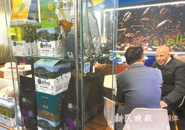 图说:来自巴西的一咖啡品牌吸引了客户前来洽谈 新民晚报记者 周馨 摄