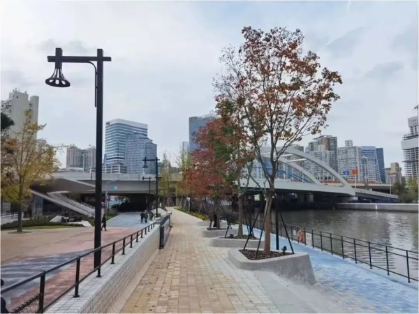苏州河虹口段从外白渡桥至河南路桥近1公里,位于“黄浦江与苏州河”这条“城市项链”的交汇处,是苏州河极具代表性的滨水岸线。从外白渡桥到河南北路,这段全长900米的北苏州路滨河空间以“共享街道+河畔客厅”为总体设计策略,将陆家嘴天际线及外滩沿岸的旖旎风光揽于怀抱,它所打造的“步行化、休闲态、全天候”的高品质滨水公共空间将吸引人们“走过来”,并让大家乐意“坐下来”。