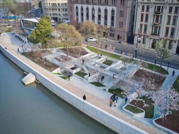 “樱花谷驿站”曾是苏州河边一个再普通不过的公共厕所和一个绿化工作用房。2020年,随着苏州河两岸绿带的改造工程,这里被“化腐朽为神奇”,一跃成为一个美丽的公共空间,和立体的观景平台,让人们多种角度体验享受滨河景观的同时,在樱花环绕中穿梭漫游。