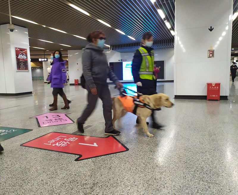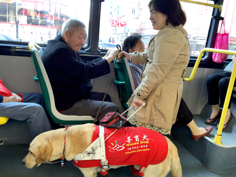 在上海,盲人可以携带导盲犬入公共场所、乘坐地铁等交通工具,可以说这是文明的一种体现。
