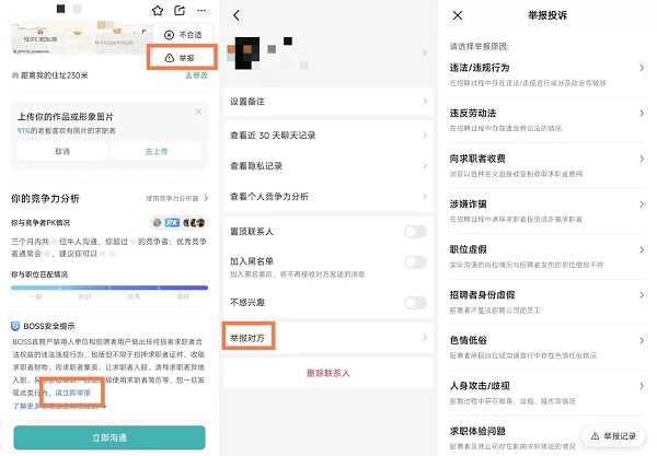 11月13日,为畅通求职维权通路,保障求职者就业权益,BOSS直聘安全团队发布了系列求职提示。提示重点提醒求职者,尽量在平台内完成沟通,在沟通过程中建立存证意识。在求职过程中如果出现权益受损,可立即向平台举报。接到线索后,安全团队将迅速跟进核查,对涉事招聘者进行处置。全过程严格保障举报用户隐私安全。