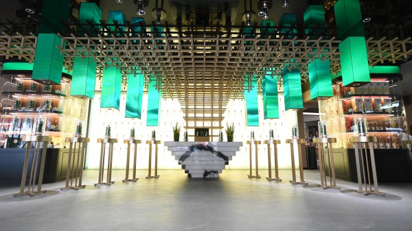 进入店内,首先映入眼帘的创意斗拱装置。原质木条横竖错落堆叠,以灵动的造型从天花板延伸下来。这个象征和代表中华古典建筑精神和气质的斗拱创意,是对凝聚千年智慧的传统技艺在时代发展中焕发新生的致敬。这必然也是对全兴650年酿造技艺的致敬。斗拱下的展台上,陈列着熊猫酒及其礼盒装产品。木色斗拱为背景,绿色植物点缀,将熊猫酒蕴含的和润东方美学进一步具象化。