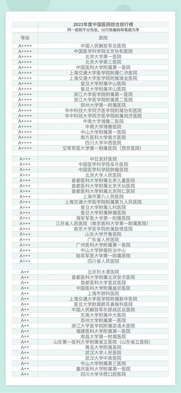 今天下午,由全国近6000名国内著名同行专家参与评选的复旦版《2023年度中国医院综合排行榜》和复旦版《2023年度中国医院专科声誉排行榜》在上海发布。全国共有100家医院进入《2023年度中国医院排行榜》,45个专科(前10名)榜上有名。榜单最大的变化在于,今年医院排行榜不再直接排名次,而是分为5个等级,按行政大区编码(华北、东北、华东、华中、华南、西南、西北)排列,同等级排名不分先后,院名笔画少为先。上海的仁济、瑞金、中山、华山四家医院位列最高等级,即A++++等级。