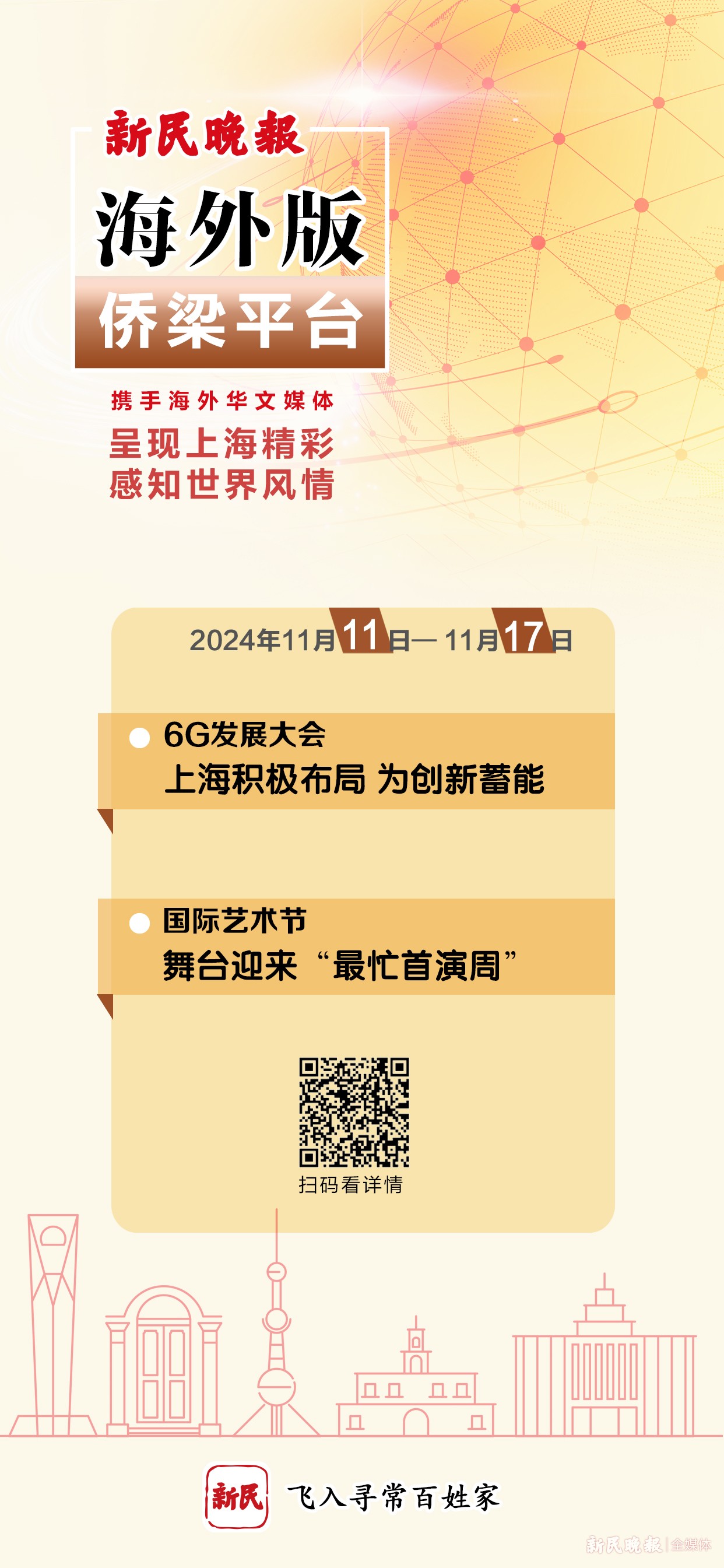 2024年11月11日-11月17日,新民晚报海外版侨梁平台,携手海外华文媒体,呈现上海精彩,感知世界风情。6G发展大会在上海举行,来自海内外的行业专家和创新精英们共聚一堂,共谋6G创新发展;国际艺术节如火如荼,艺术节的56台参演剧目中,在沪首演比例超9成,“最忙首演周”呈现13部剧目。