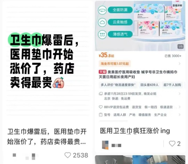 一位电商业内人士告诉媒体,“11月18日,淘宝‘医生卫生巾械字号’词条的搜索人气环比上涨3920%,此外医用垫巾、医用护垫等词条搜索量也环比上涨超635%。”