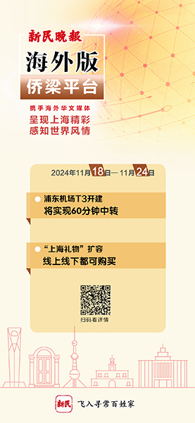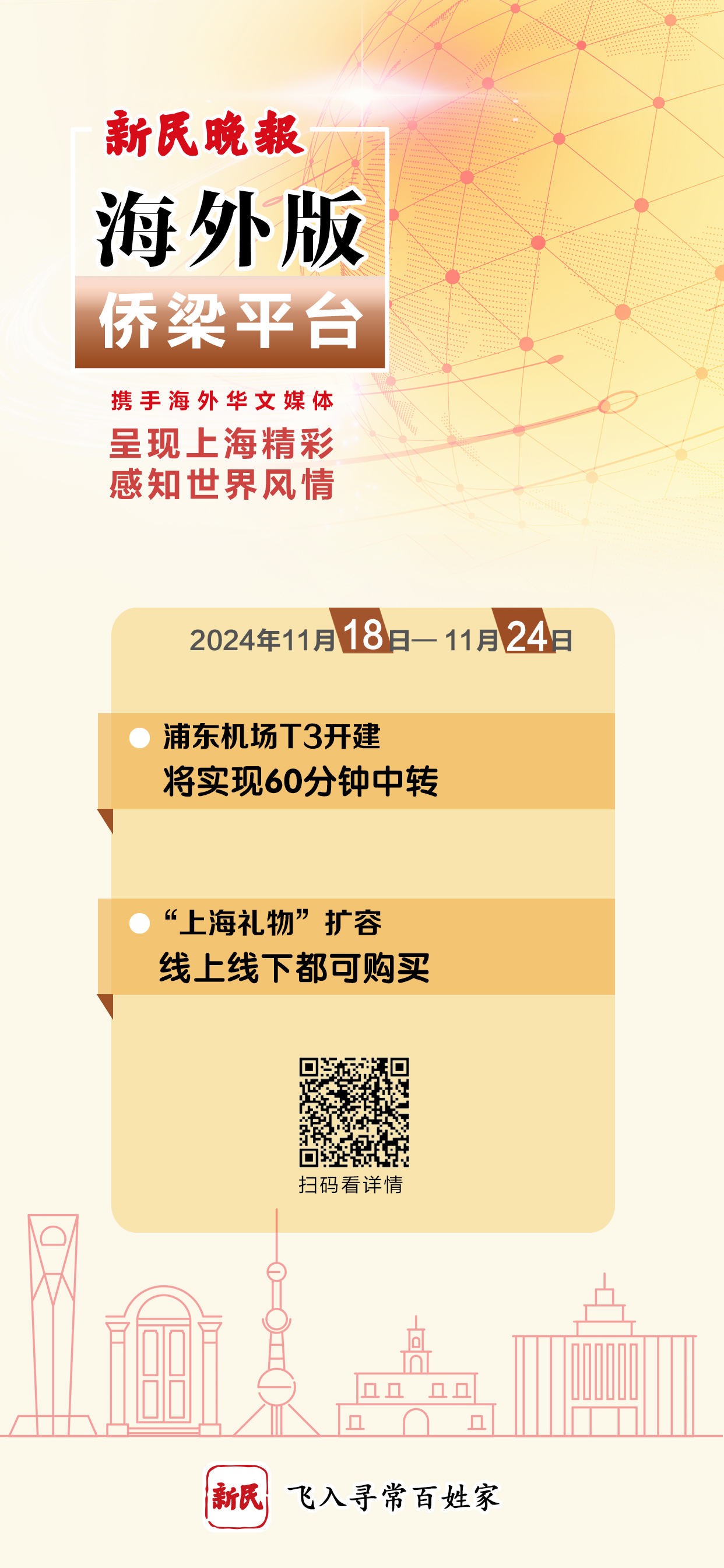 2024年11月18日-11月24日,新民晚报海外版侨梁平台,携手海外华文媒体,呈现上海精彩,感知世界风情。浦东机场T3航站楼开建,三个“百分百”带来值机新体验;“上海礼物”扩容,吃的用的玩的,满满上海味道……