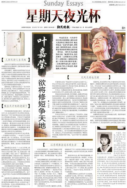叶嘉莹的名字曾数次出现在本报。2016年7月10日的“星期天夜光杯”封面刊登整版由学者叶国威撰写的《叶嘉莹 欲将修短争天地》一文,向本报读者娓娓道来与叶嘉莹交往的细节,令人动容。2017年,4月16日,闫晓铮的《重回视野的“朗读者”:叶嘉莹》一文写了央视《朗读者》栏目的嘉宾叶嘉莹。(新民晚报记者 徐翌晟)