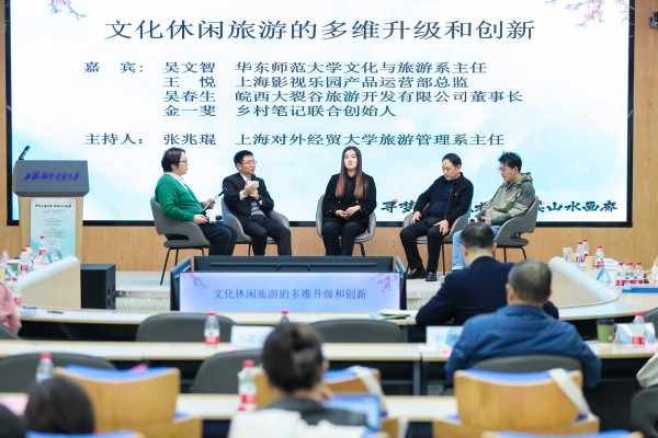 活动最后,上海对外经贸大学旅游系主任张兆琨主持,华东师范大学文化与旅游系主任吴文智、上海影视乐园产品运营部总监王悦、皖西大裂谷旅游开发有限公司董事长吴春生、乡村笔记联合创始人金一斐等多位嘉宾齐聚一堂,围绕“文化休闲旅游”等话题展开了一场深度圆桌讨论。讨论过程中,各位嘉宾积极分享自己的专业见解与实践经验,从政策支持、文化挖掘、产业融合、科技应用等多个维度深入探讨,为文化休闲旅游的未来发展提出了丰富的创意和独特的解决方案。这场精彩纷呈的对话,不仅启发了与会者对行业发展的全新认知,也为推动文化休闲旅游的多元化与创新升级提供了宝贵的思路和方向。