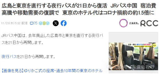 据介绍,此次恢复运营的夜行巴士名为“梦想特快广岛号”,连接广岛和东京两地。晚上20:50从广岛巴士中心发车,全程约10.5小时,第二天早上8点左右到达东京。从东京出发的则是晚上21:10分,从东京站开出,第二天早上抵达广岛。这一条夜行巴士线路,于1989年由“JR巴士中国”和广岛电铁等四家公司开通运营,当时名为“新微风”,但在2023年春季时因乘务员人手短缺,以及收益不佳而停运。