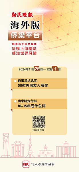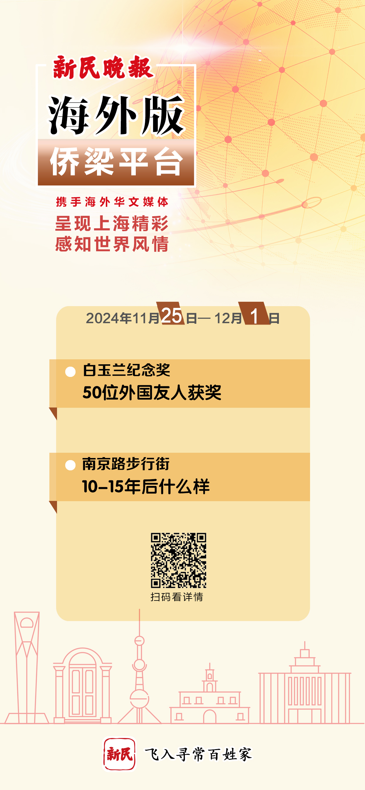 2024年11月25日-12月1日,新民晚报海外版侨梁平台,携手海外华文媒体,呈现上海精彩,感知世界风情。2024年上海市“白玉兰纪念奖”颁授仪式举行,50位杰出外籍人士讲述他们的“上海故事”;南京路步行街区功能规划来了,三大规划理念、四大功能分区、三大转承场景带来新变化。